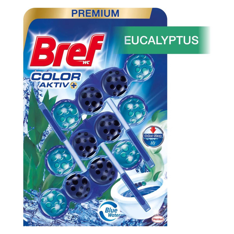 BREF WC blok Blue Aktiv Eucalyptus 3 x 50 g WC blok na hygienickú čistotu a sviežosť vašej toalety Nové zloženie kolekcie WC blokov Color Activ zaručuje o 50 % viac lesku* na povrchu toalety (*v porovnaní so suchým povrchom bez použitia WC bloku) WC blok BREF Color Aktiv chráni toaletu pred tvorbou vodného kameňa a zabraňuje zadržiavaniu nečistôt Viditeľný čistiaci zážitok s modrou vodou udržuje čistú toaletu WC blok BREF s vôňou eukalyptu prevonia celú miestnosť Aktívnou zložkou je čistiaca pena, ktorá čistí toaletu pri každom spláchnutí – WC blok BREF je tak najľahší spôsob ako udržať vašu toaletu čistú a so sviežou vôňou kvetov Cena je za bal./3 ks