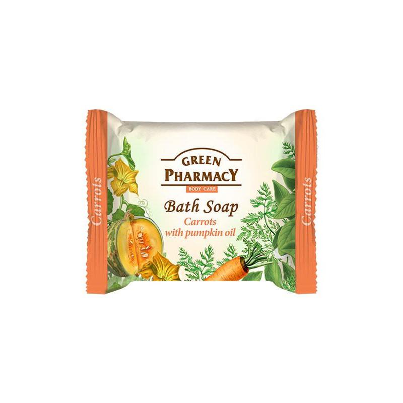 Jedinečné toaletné mydlo Green Pharmacy s prírodnými zložkami efektívne čistí, hydratuje, zvláčňuje pokožku a zlepšuje jej ochranné funkcie. Obohatené o mrkvu s pomarančovým extraktom a tekvicovým olejom. Betakarotén, na ktorý je mrkva bohatá, potláča negatívny vplyv voľných radikálov vznikajúcich pôsobením UV žiarenia, zbavuje pleť škodlivín a podporuje proces jej regenerácie. Tekvicový olej obsahuje spomedzi minerálnych látok zinok, fosfor, selén, magnézium, mangán a ďalších šesť látok. Tiež sa môže pochváliť vysokým zastúpením celého spektra vitamínu B a aj pre krásu prospešného E-čka. Vhodný je aj pre ľudí trpiacich ekzémom, psoriázou a používať ho môžu aj malé deti. Dodáva jej zároveň stratenú elasticitu a zlepšuje jej vzhľad.