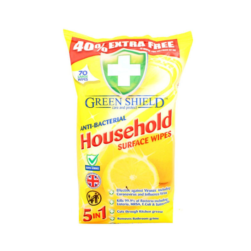 Green Shield vlhčené utierky na povrchy 5v1 antibacterial Citrón 70 ks Antibakteriálne vlhčené obrúsky určené na všetky umývateľné povrchy v domácnosti alebo aj mimo domácnosti. Zabíja 99,9% baktérií a vírusov. Sú skvelé na mastnotu v kuchyni alebo nečistoty v kúpeľni. Balenie obsahuje 70 obrúskov. V súčasnej situácii obrúsky odporúčame používať na dezinfekciu povrchov: madlá nákupných košíkov, tlačidlá výťahu a iných povrchov kde si nie ste istí históriou povrchu. Cena je za 1bal./70ks