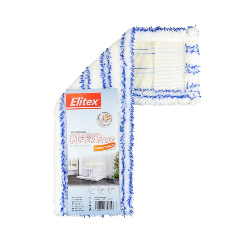 Náhrada ELITEX na mop SUPER Vysoko kvalitný mop vyrobený z kvalitného mikrovlákna, ktorý je určený na menšie nerovnosti podláh a ľahké až stredné znečistenie, pás štetín umožňuje vyššiu čistiacu účinnosť, v porovnaní s bežnými textilnými mopmi. Zvlášť vhodné pre pravidelné čistenie a základné čistenie kamenných podláh, obkladov a dlažieb, keramickej dlažby, mramoru, bezpečnostná dlažba, PVC, parkety, drevené, laminátové a mnoho ďalšieho. Vysoká hustota vlákien z mikrovlákna, zabezpečuje veľmi vysoké absorpčné vlastnosti. Rovnomerné rozloženie štetín cez celú šírku mopu, umožňuje odstrániť aj odolné nešistoty. Svoje využitie nájde v priemysle, klinikách, domovoch dôchodcov, opatrovateľských domoch, verejných zariadeniach ale aj v v domácnostiach. Farba: modro-biela Rozmery: 45 x 14 cm Balenie obsahuje 1 ks