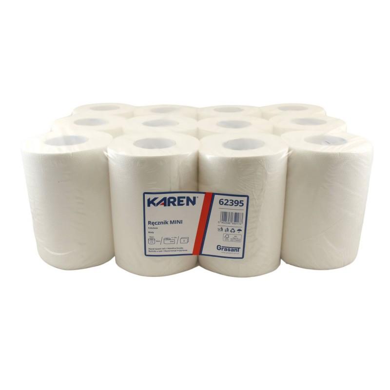 Papierová utierka KAREN 14 cm, 65m, 2 vrst. bal.12ks Centerfeed Papierová utierka KAREN Priemer:14 cm Návin: 65m 2 vrstvová perforovaná Vyberateľná perforovaná dutinka Materiál: 100% celulóza Cena za balenie 12ks.