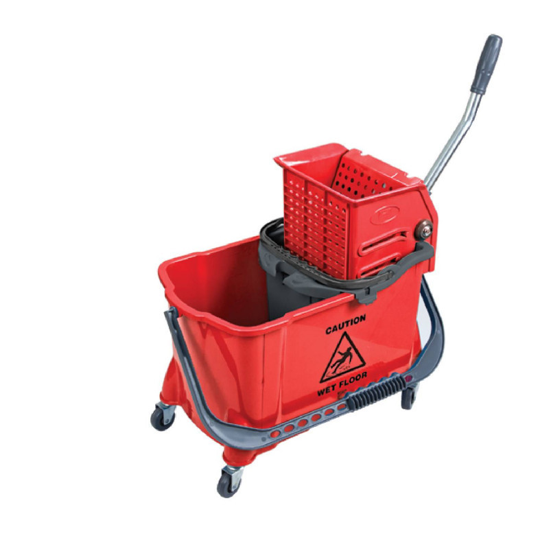 Upratovací vozík KENTUCKY PROFI červený 24 L + 8L žmýkač Vozík KENTUCKY PROFI pozostáva z dvojkomorového vedra z kvalitného plastu ABS, ktorý sa vyznačuje vysokou odolnosťou proti prasknutiu. Používa čeľusťový lis, ktorého je súčastou 8 litrové vedro na znečistenú vodu.Vďaka kvalitnému lisu je proces žmýkania ľahký. Tento lis pracuje s plochými ako i šnúrkovými mopmi a jeho oceľová rukoväť vám umožňuje bezpečný pojazd s vozíkom. Vhodný pre menšie prevádzky a domácnosti.
